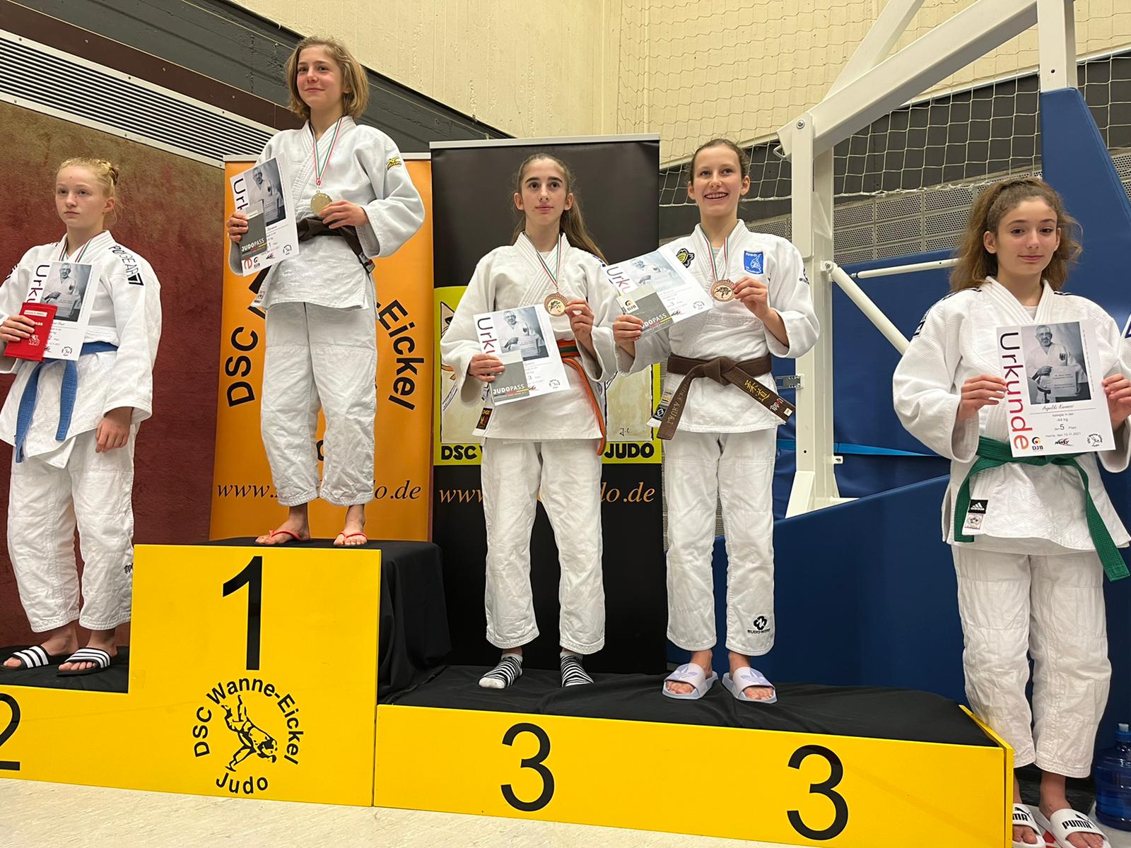 Polina schickte ihre badische Gegnerin nach 5 Sekunden mit einem Fußstopwurf von der Matte. Im zweiten Kampf ging es etwas länger gegen eine Gegnerin aus Württemberg. Sie wurde mit einer Bodentechnik besiegt. Im dritten Kampf wurde hart gekämpft. Im Golden Score genügte eine kurze Unaufmerksamkeit und Polina verlor mit einer kleinen Wertung. Somit ging es auch für sie um Platz 3! Sie traf nochmal auf ihre erste Gegnerin. Sie ging mit einer Innenschenkeltechnik in Führung und konnte ihre Gegnerin dann am Boden zur Aufgabe zwingen. Polina errang den dritten Platz!